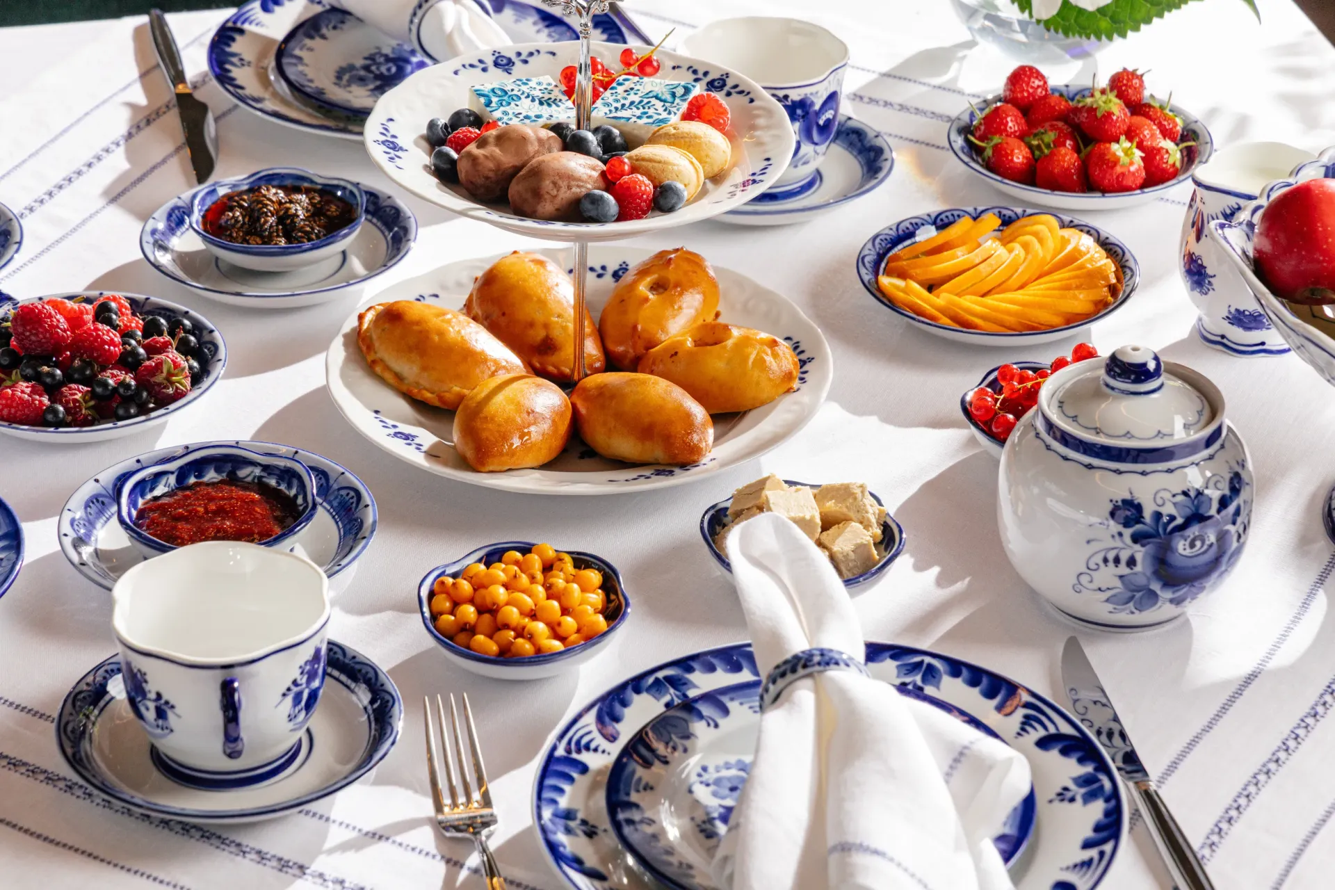 Атмосфера ресторана соткана из деталей: мягкий приглушенный свет, теплые оттенки интерьера в сочетании с народной росписью в посуде и декоре. Проект создан в коллаборации с Объединением «Гжель», и это делает пространство особенным. Синий кобальт становится не просто узором, а нитью, связывающей поколения.