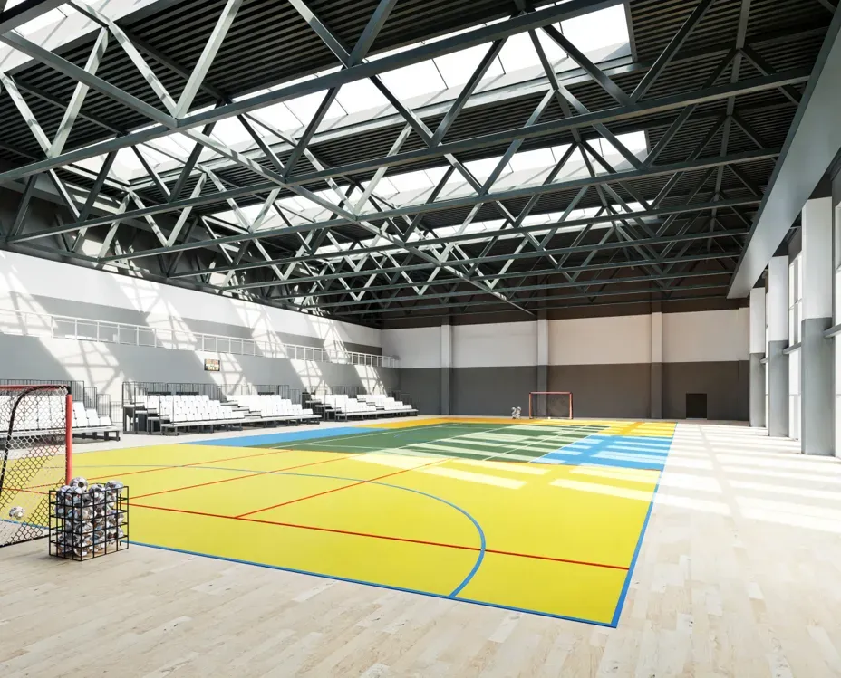 Гардероб + 2 раздевалки по 37 человек. Многофункциональный спортивный зал, предназначенный для проведения соревнований, корпоративных турниров и тренировок по различным видам спорта: от футбола, волейбола, турниров в различных видах единоборств до художественной гимнастики, спортивных танцев.